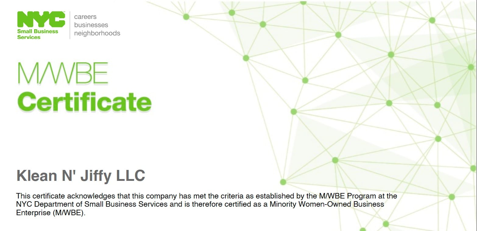 Klean N’ Jiffy is officially certified as a Women-Owned Business Enterprise (M/WBE). This certification demonstrates our commitment to delivering superior cleaning services while promoting inclusivity and supporting local businesses in New York.